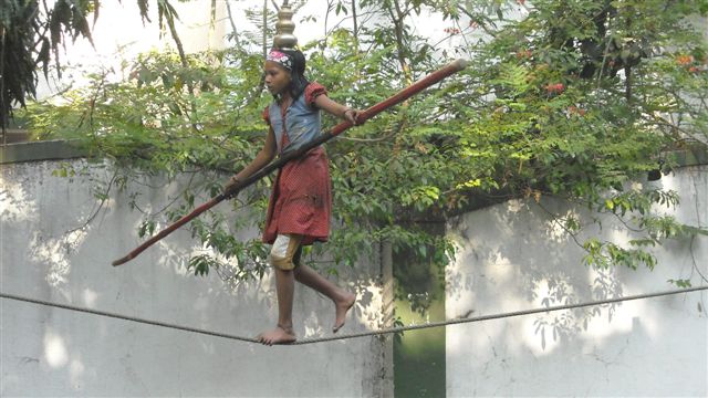 הודו פונה 2009להקת רחוב פותחת במופע של להטטנות הליכה על חבל הנמתח בין שני מוטות גבוהים, הממוקמים במרחק אחד מהשני ובדרך מפתיעה יציבים. ילדה חדת תנועה מכוונת ובטוחה בפסיעותיה, כמה מטרים מעל האדמה הולכת הלוך וחזור בכול פעם בצורה מסוגננת אחרת. פעם מחזיקה במקל רוחבי לאיזון, פעם על חד אופן, ופעם אחרת כורעת ברך. הגוף שלה מיומן ואינו מהסס. חושיה דרוכים והפחד ממנה והלאה. למטה ישנו איש המתופף בקצב קורא לעוד אנשים להתקהל ואישה נוספת הטופחת על מתקן מתכתי המוסיף צלילים להמולה. הבחנתי בכול האירוע מחלון אולם היוגה בו תרגלתי. כהרף עין זינקתי מהמזרון דילגתי במדרגות ומצאתי את עצמי ברחוב יחפה עם מכנסי היוגה הקצרים. המופע מעורר את הצופה מהצד. מהפנט ומרתק מעצם העובדה של הליכה על חבל דק, הליכה כמו מרחפת, מחליקה באוויר בעוד רגליו הוא נטועות בקרקע. לאחר דקות ארוכות הקסם נגמר. ילדת "הפרא" נוחתת לקרקע ומתחילה לאסוף כסף לקופסת הפח שבידה, גוערת במי שלא נתן. האיש מקפל את המוטות שביניהם נמתח החבל. הילדה האיש והאישה נעלמים והרחוב לובש את צורתו הרגילה. הלהקה נעלמה כלא הייתה. בחזרה באולם היוגה. המורה הגדול שלי ליוגה גם הוא הביט מהחלון. בו ברגע הניח שני מקלות עגולים ודקים על הרצפה ובקש מתלמידה ללכת עליהם כמו חיקוי להליכה על החבל. כף הרגל שמשדרת פולסים עד למוח מלמדת את אומנות השיווי משקל. המראה חזר אלי במשך היום כשאני על מזרון היוגה מתאמנת בתנוחות שיווי משקל כמטפורה לחיים "הליכה על חבל דק". על הפחד מליפול, על להתנסות בפחד הזה ולחצות אותו. על ההבנה שהחיים מזמנים סיטואציות בהם פעולותינו דורשות מיומנות כאותה ילדת פרא קטנה שהולכת לה למעלה מאוזנת יחד עם הישרדות בסיסית גשמית. |
