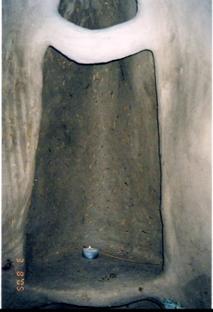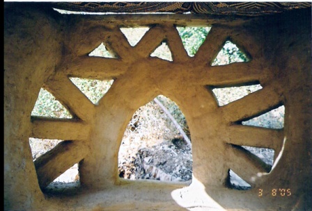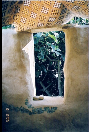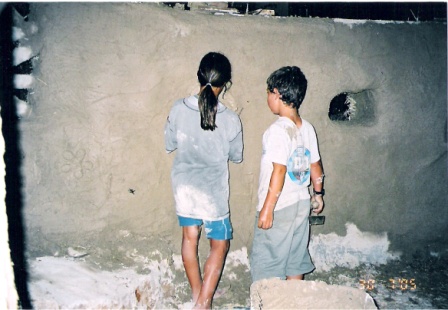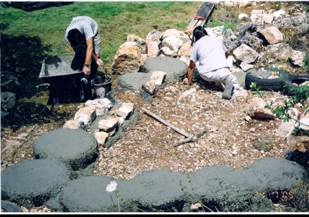 | דינה בעבודה על מבנה הבלות | ציפוי היסוד בבטון | מבט אל החלון הדרומי | |